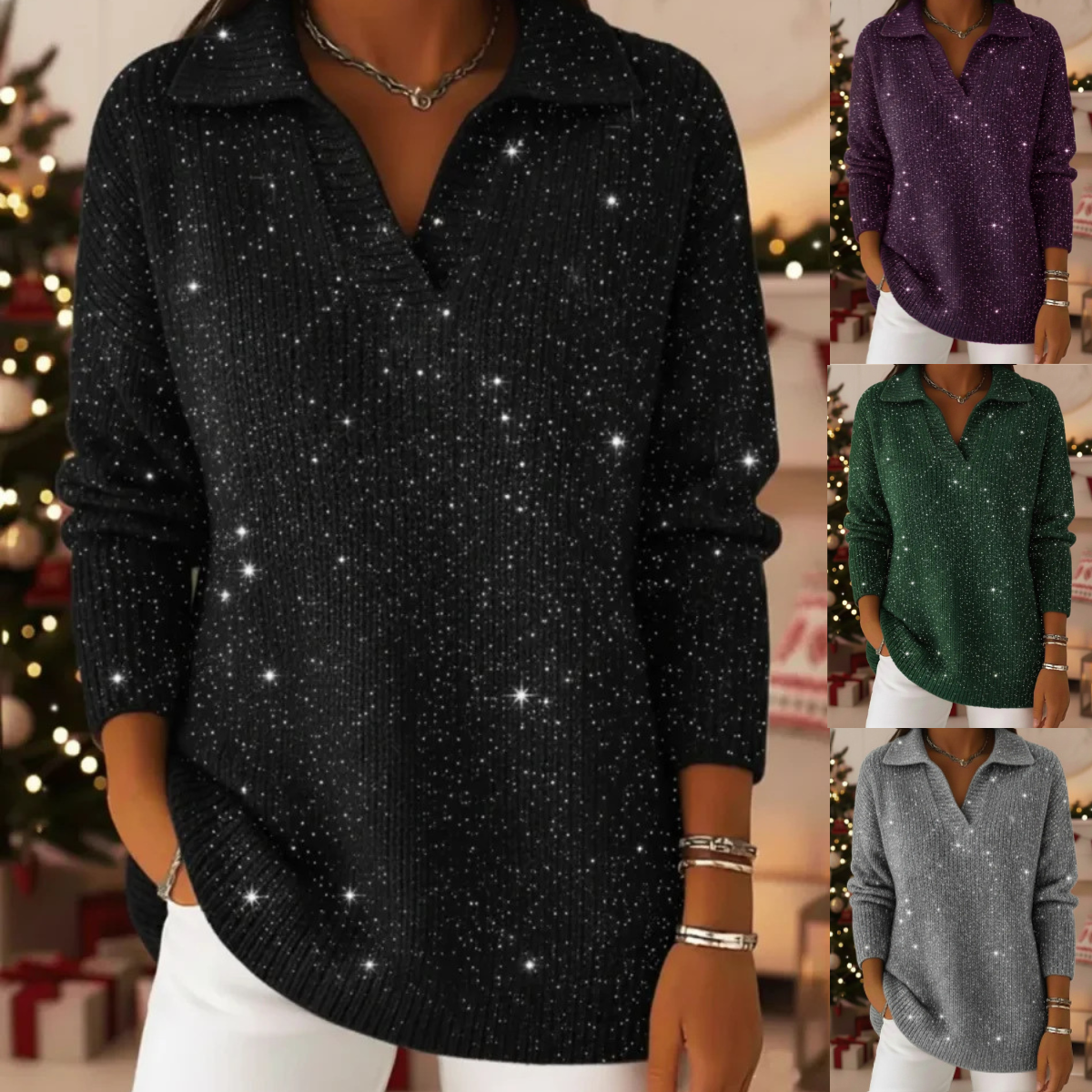 🔥Produkt hitowy -50%🔥【S-3XL】Marzycielski damski, modny i elegancki sweter z dzianiny z dekoltem w serek i wzorem rozgwieżdżonego nieba